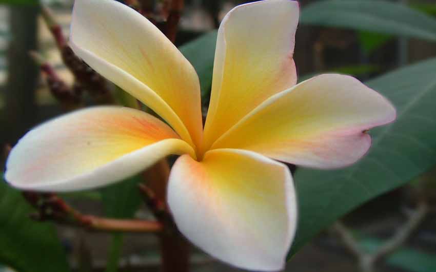 プルメリアの花が咲きました。来週店頭にて販売いする予定で、色は画像を参考にして下さい。プルメリアは、沢山花目が付くので、咲き始めると永い間楽しむ事が出来、香りも良くバリ島やハワイ通には欠かす事の出来ない花ではないでしょうか?今週さらに市場にも注文している為5鉢入荷する予定です。お楽しみに!最近プルメリアを育てて見たいと言う方が増え、どうやれば枯れさせずに育てられるかとか、花を咲かす事ができるかなど、よく聞かれます。基本的には、湘南でも十分育てる事が出来ます。冬は室内にしまい、成長が止まる15度以下になったらお水を制限し10度以下になるくらいからお水をあげるのをほぼ止めましょう。春先気温が10度を超える日が増えだしたらお水をあげ始め成長を見守りましょう。(冬でも葉があり室内の温度がそれほど低くないのであれば回数を減らしてお水はあげましょう)次に花を咲かせたい!そんな悩みも多いと思います。手っ取り早いやり方は、春先の根が動き出す季節に、植え替えます。根を軽くほぐし、培養土、赤玉土、パーライト、バーミキュライトを混ぜた土に植え替えます。その時にマグァンプKなどリン酸(P)値の高い液肥を混ぜると良いでしょう。植え替えたら、天気の良い日は日に当て、初夏5月~6月は外に出しっぱなしでも平気です。枝や季節にも寄りますが、たいてい花を咲かせる事が出来るでしょう。湘南の季節感だと、秋の終りに近づく頃花目を持つ物もありますが、上手くやれば翌年の春に止まっていた花目が上がり始め花を楽しむ事が出来るでしょう。永くなりましたが、意外と簡単に育てられるので、育てて見たいと言う方は、当店のスタッフが詳しく教えますので是非チェレンジしてみて下さい。