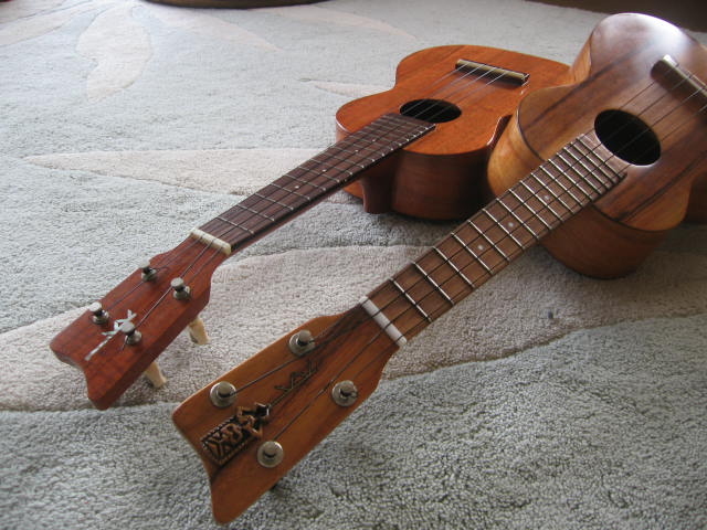 このウクレレは、両方Kamakaと言うハワイのブランドで、今回買ってしまった方は、手前のヘッドにTiki(ハワイの守り神)の付いている方です。製造年月日は1972年と言う事で僕の2つ下の後輩です。本当は産まれた年の物が欲しかったんですけど、このTikiヘッドKamakaですら中々出会える物では無いので買っちゃいました。